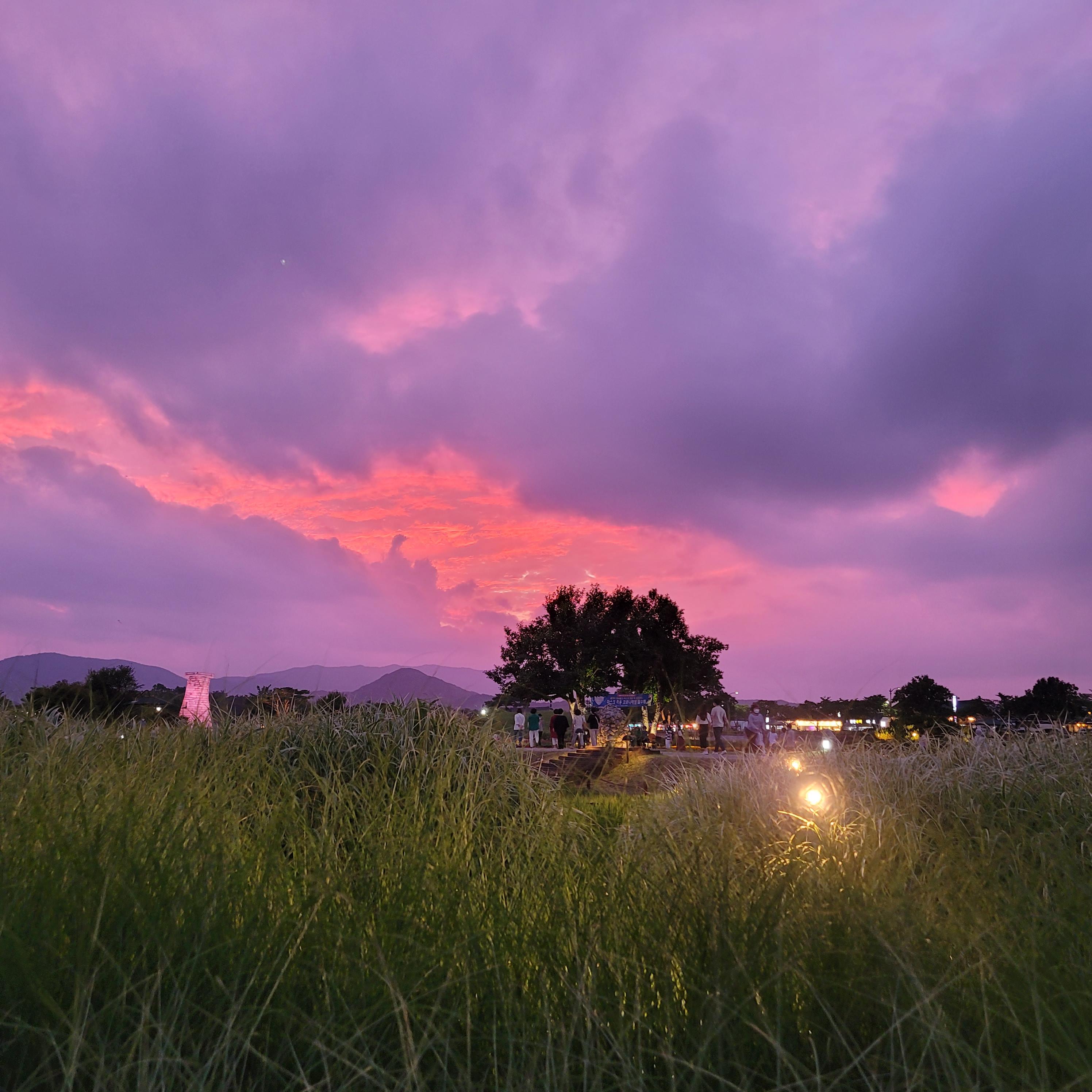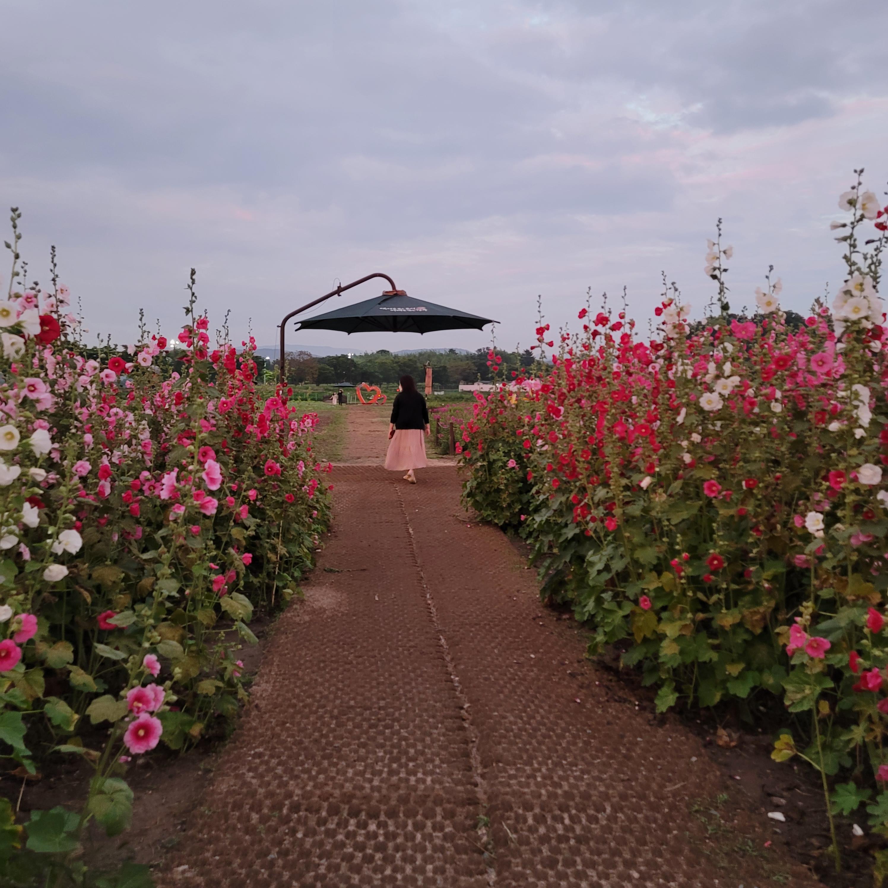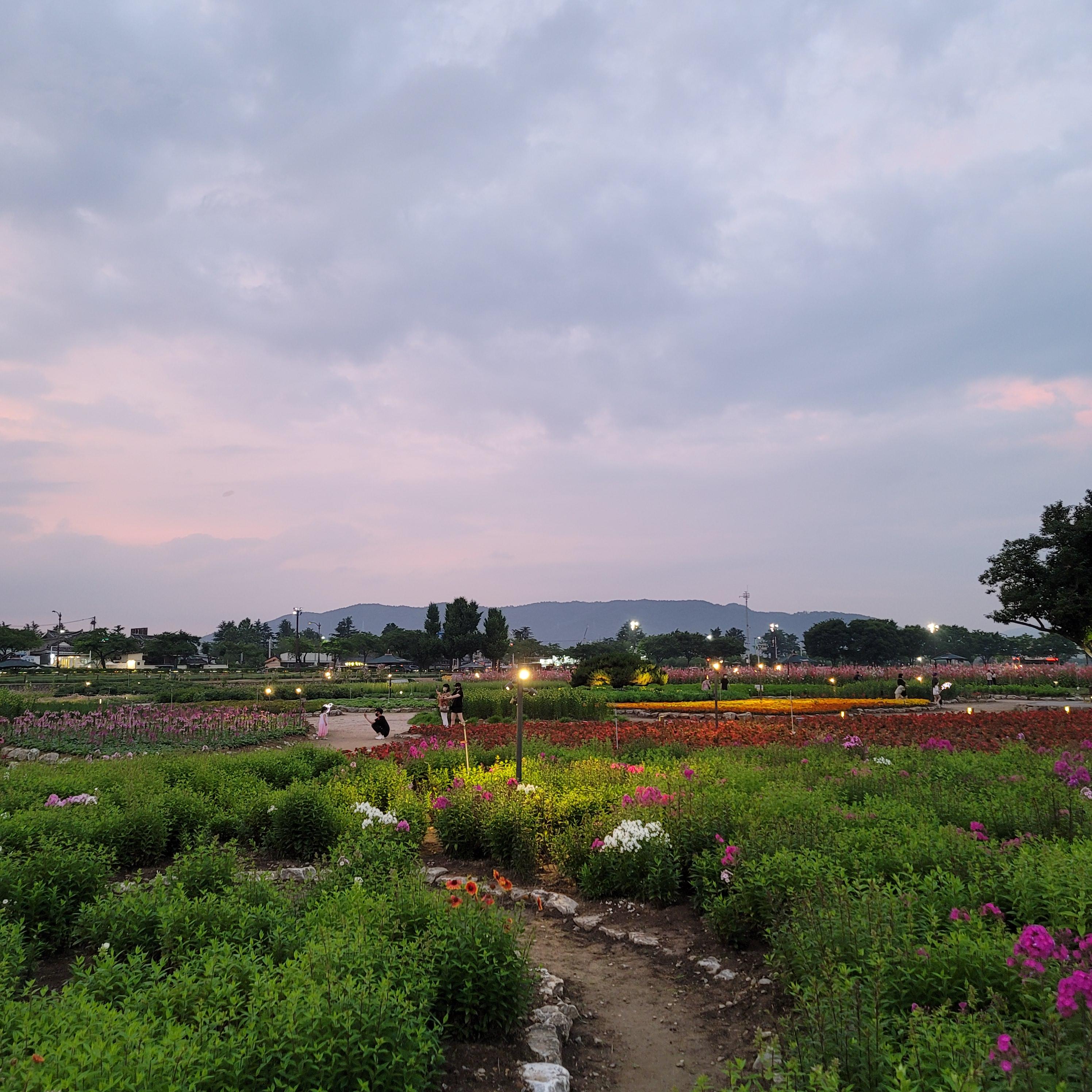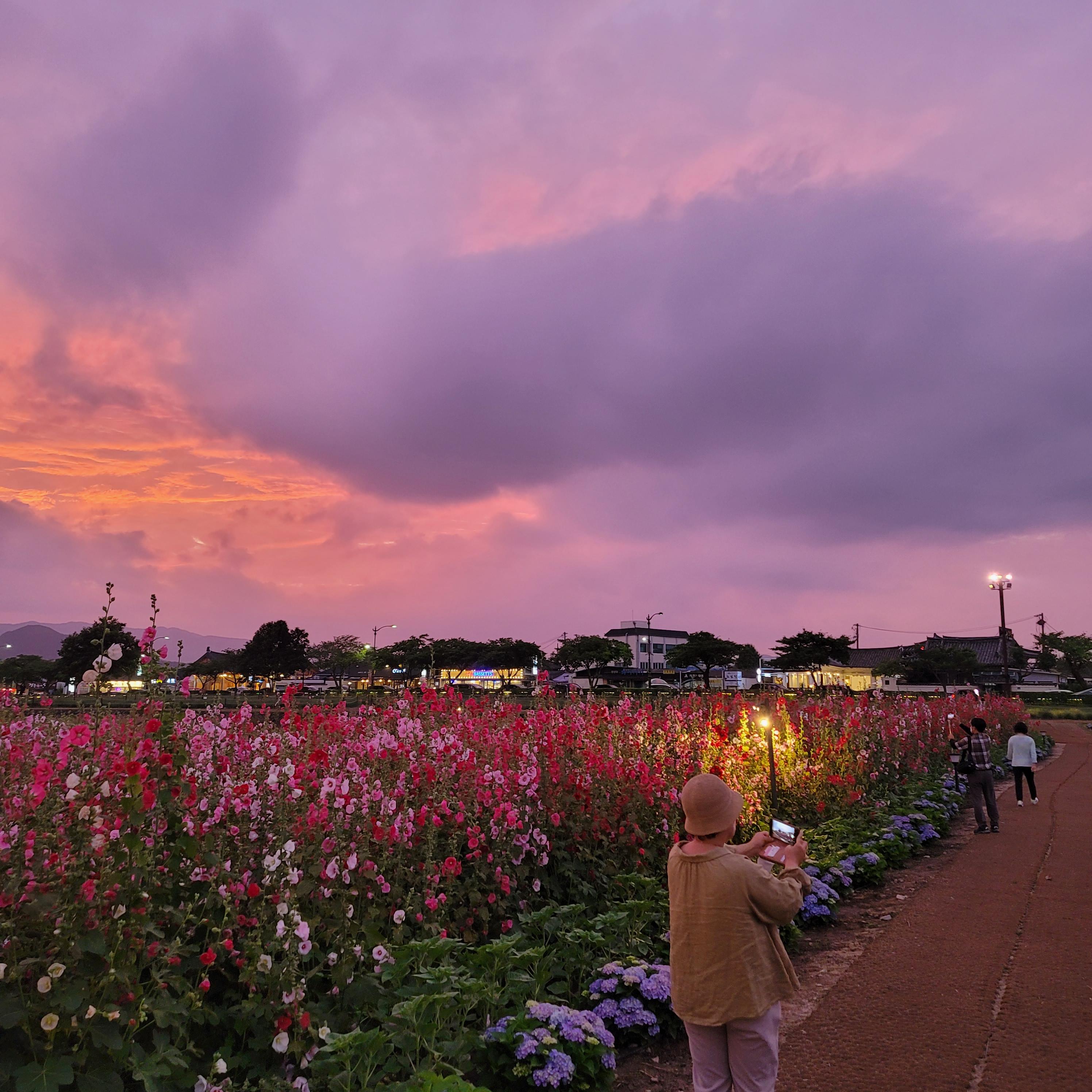 해질무렵에 저녁노을과 꽃밭의 풍경이 아주 아름답습니다.