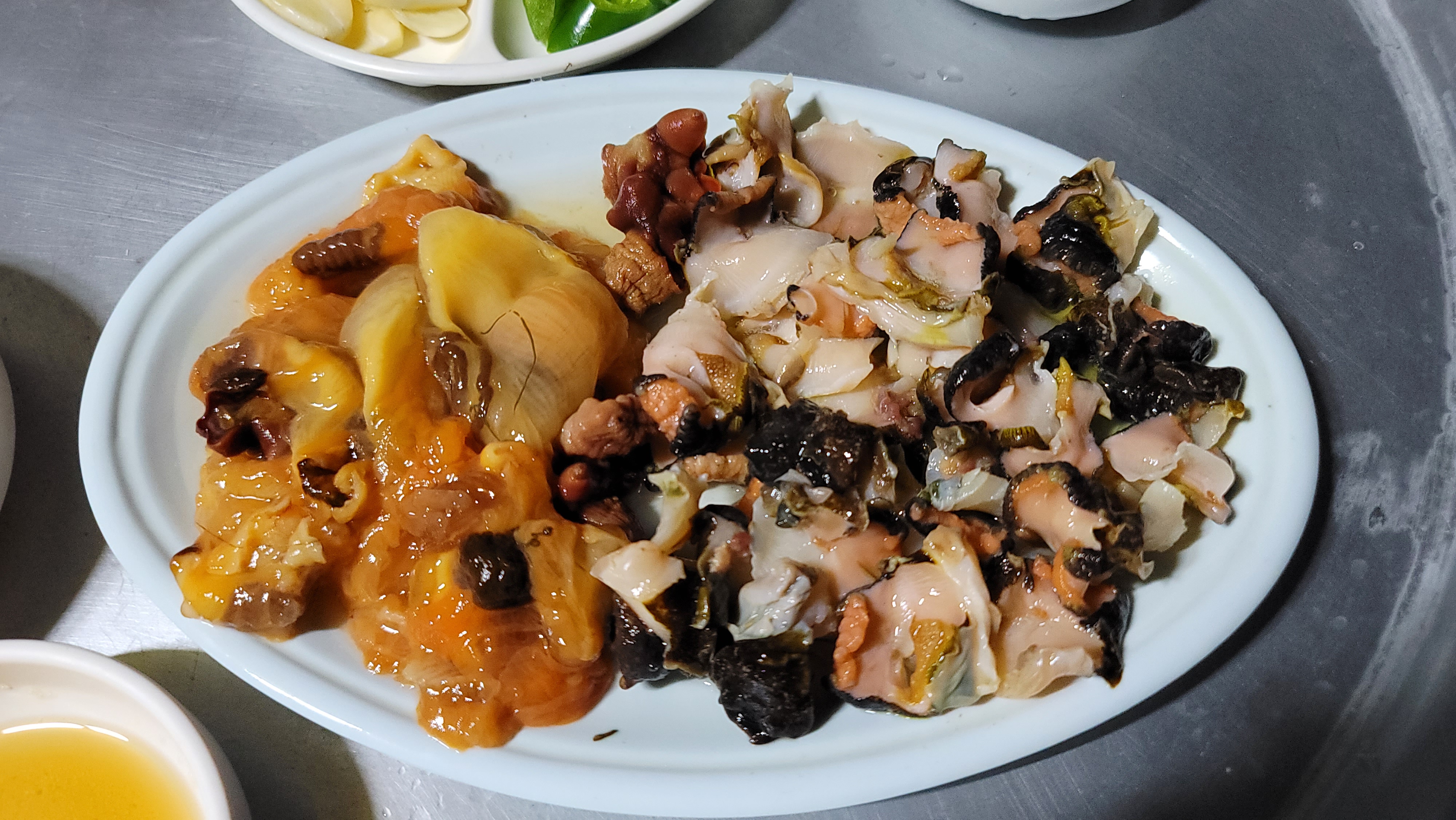 할머니께서 장사하시는데 이 해산물과 잔치국수가 끝내준다. 늦게 도착해서 마감 하면 어쩌나하고 급히 갔는데 할머님 께서 마지막 손님으로 받아 주셨다. 일단 잔치국수 한그릇과 해산물 한접시에 소주두병 먹고 준비 한다.